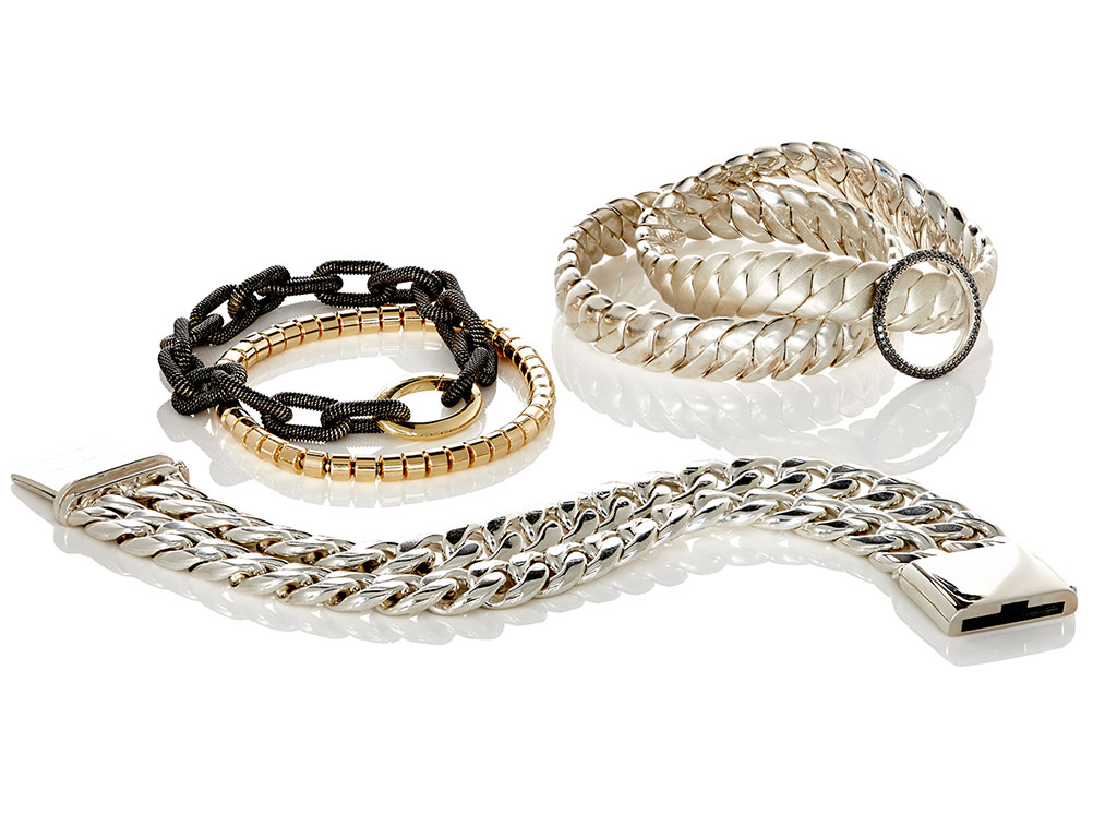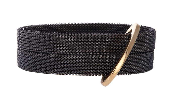 Los diseños están fabricados con oro blanco y amarillo, de 18 quilates, robusta plata esterlina, malla de acero estirable y diamante lavé, en color negro.