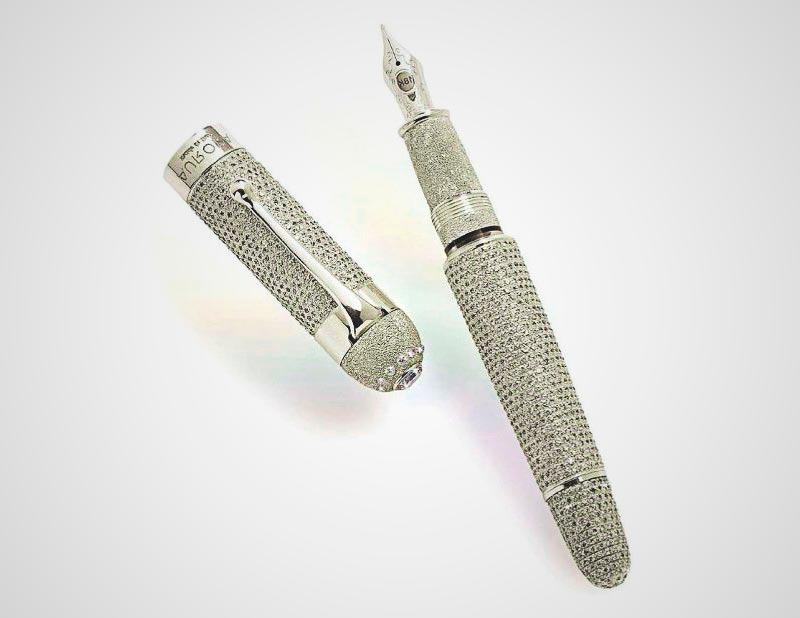 La firma italiana Aurora, es de las más prestigiosas en la elaboración de plumas de lujo; uno de sus modelo es “Aurora Diamante”. Esta pluma debe su nombre a que está cubierta de platino sólido, en el cual van más de 1,900 diamantes, ya sean negros o blancos. Además, la punta está hecha de oro blanco sólido de 18 quilates. El precio es lo que más impresiona, ya que sobrepasa el millón de dólares.