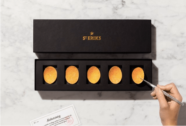 ¿Tienes ganas de disfrutar de unas papas fritas mientras ves tu serie favorita? La empresa sueca St. Erik’s Berry ofrece un paquete de 5 papas con un valor de $59 dólares. Este bocadillo se elabora de manera especial con diversos peculiares ingredientes como setas Matsutake, alga trufada, cebolla Leksand, eneldo y una papa que se cultiva sólo en algunos países escandinavos.