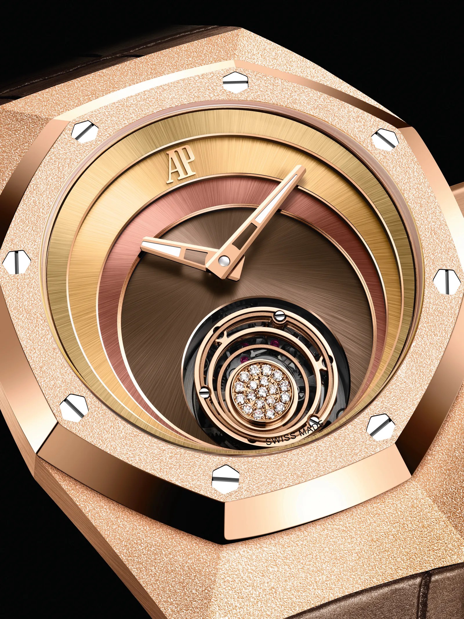 Otros elementos que hacen de este reloj una verdadera maravilla son la espectacular esfera multicapa, sus cuatro placas de oro rosa circulares, que en su superposición crean un efecto de ondas emanando de la jaula del tourbillon volante a las 6 horas. Cada una de las capas presentan un color distinto, desde el marrón en el centro hasta el bronce en el medio, alcanzando los tonos dorados hacia el extremo de la esfera. La esfera se ha terminado con un acabado satinado continuando desde las agujas hacia el exterior, en una alineación perfecta entre placas.